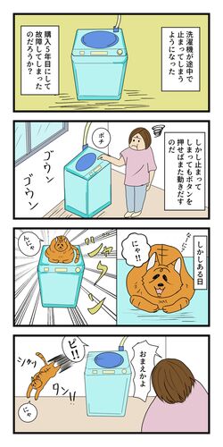 第7話 洗濯機 ある時、洗濯機が毎日のように途中で止まってしまう現象が続きました。 購入して5年、少し早い気もするけど故障してしまったのかな? 困ったなぁ困ったなぁ・・・ と思っていたら犯人はこたろうでした。 洗濯機の中がグルグル回っているのを…