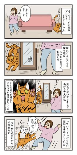 第78話 こたろうどこどこごっこ 「こたろうど~こ~?」と言うとこの遊びが始まります。 ソファーの下に隠れたり姿見の後ろだったり椅子の下だったり、色んな所にこたろうが隠れます。 はっきり言ってお丸見えです。 本人は一生懸命隠れてるので、見えない…