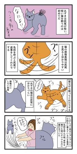 第29話 あずきの感情を知りたい 猫って尻尾の振り方でその時の感情が分かりますよね。 イライラしてる時は結構激しく尻尾を振ります。 返事をする代わりに尻尾を振って返事の代わりにしたり。 ご機嫌な時や何か興味を引く事があると尻尾がピーン!ってなり…