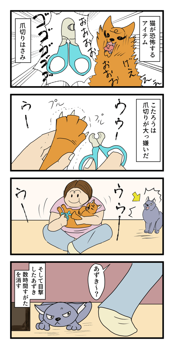 最近はだいぶおとなしくなりましたが、こたろうは2歳くらいまでは爪切り時に噛みつくし引っ掻くし唸るしシャーシャー言うしで大暴れでした。