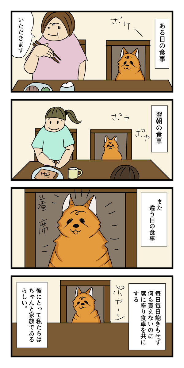 私たちが食事の用意をしてお皿をテーブルに並べる頃にいつもちゃっかり座っています。