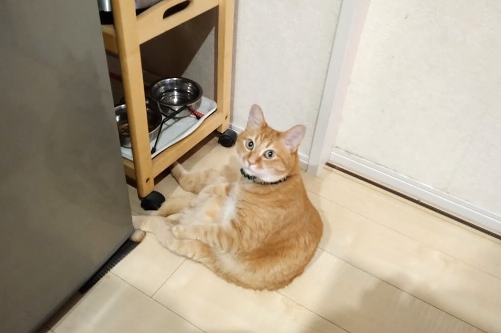 ご飯の時間に座り込みで待つこたろう。待ちの圧が凄い。