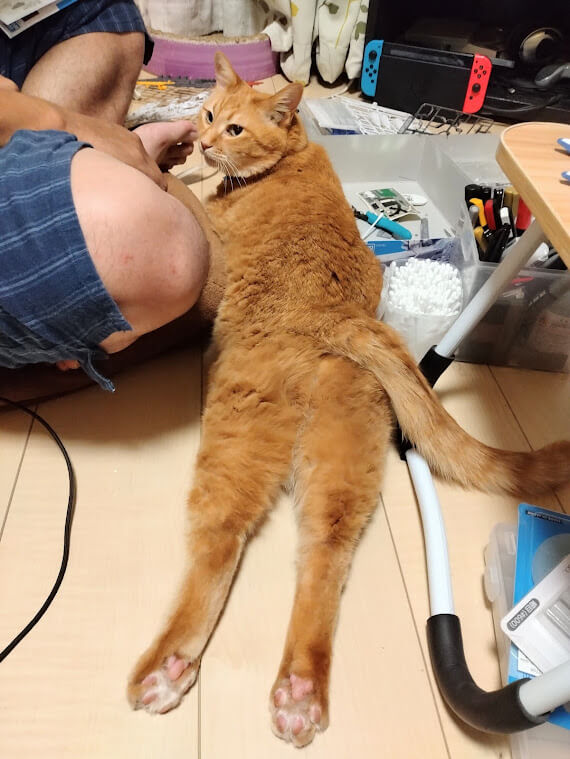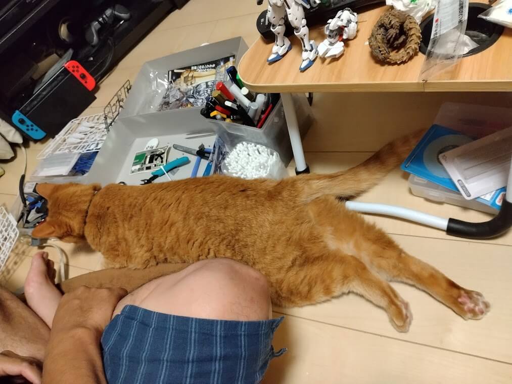 遊んでないで僕を撫でろとガンプラを押しのけて間に無理やり入ります。